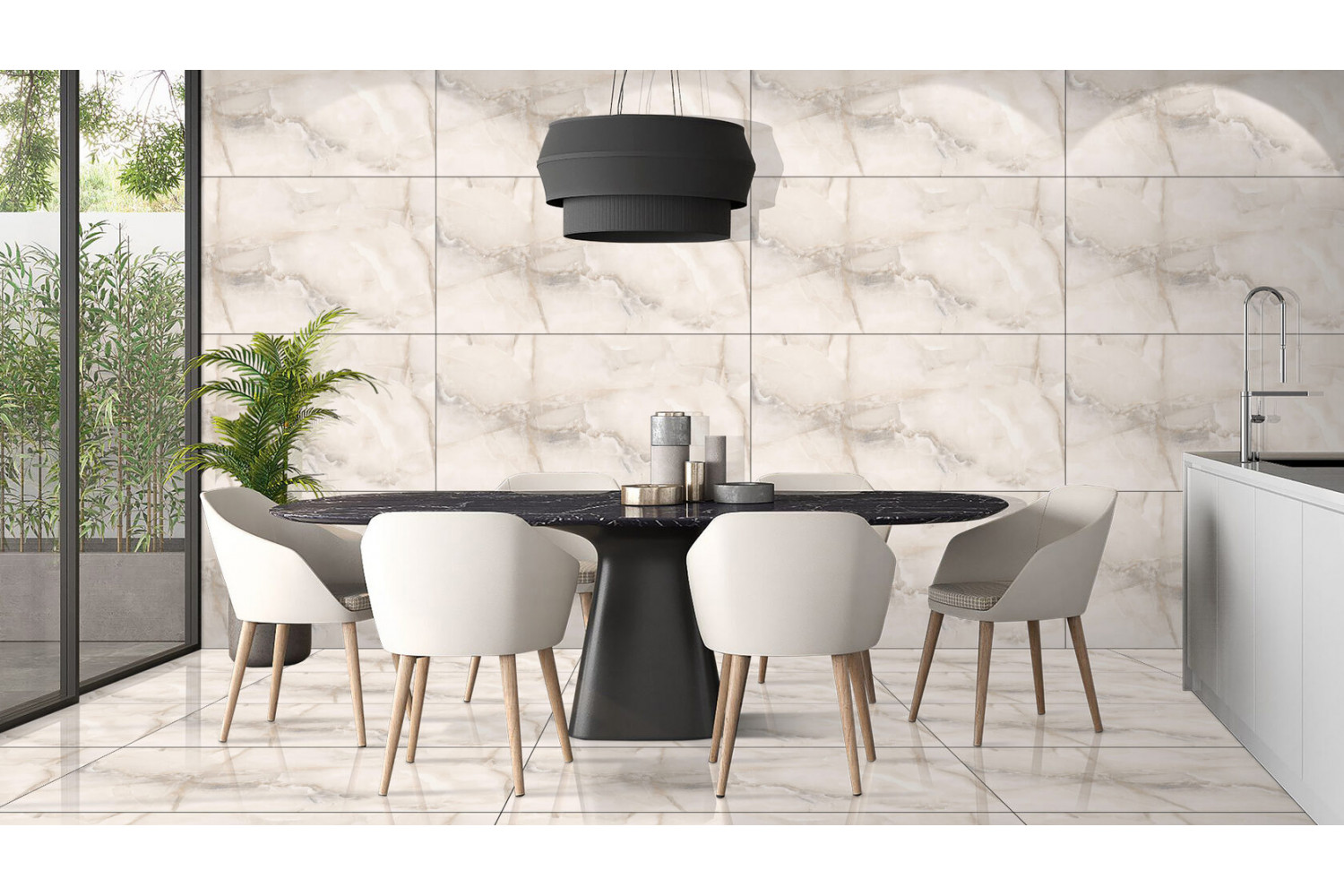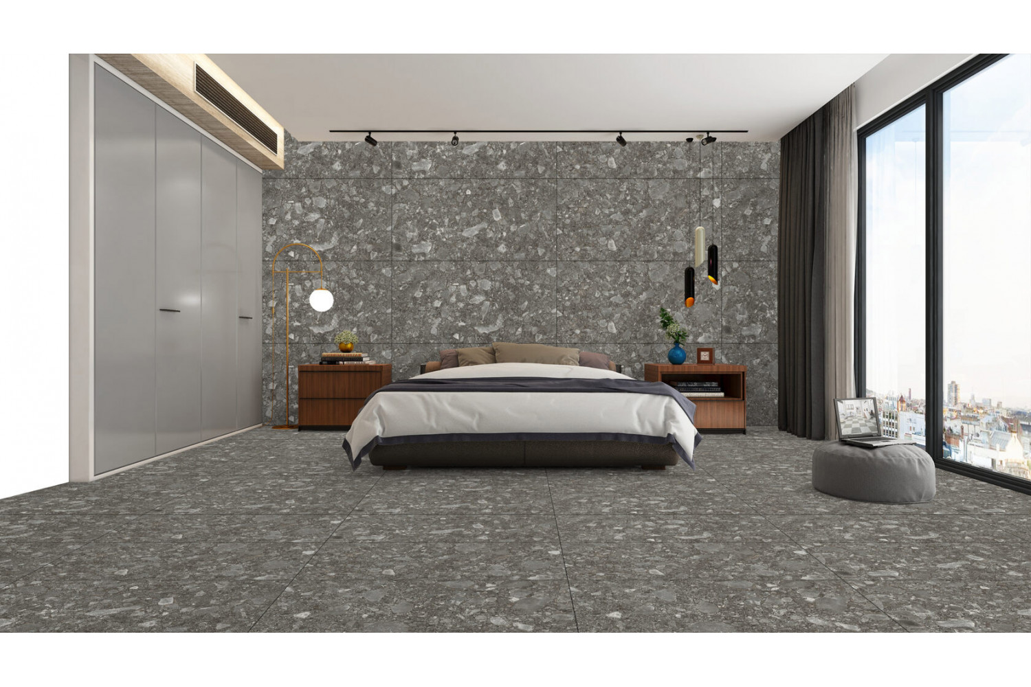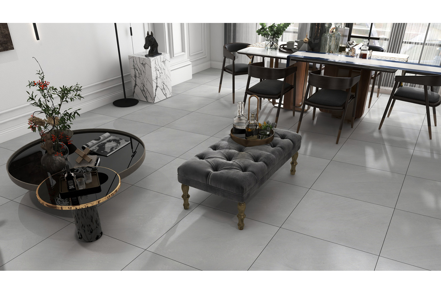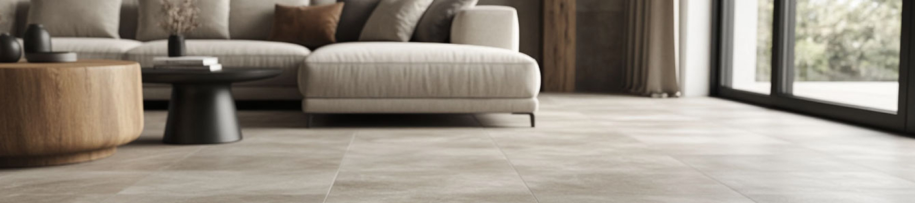 Крупноформатный керамогранит (размеры от 60×60 см и больше) минимизирует количество швов, создавая монолитную поверхность. Подходит для гостиных, кухонь и коммерческих пространств.