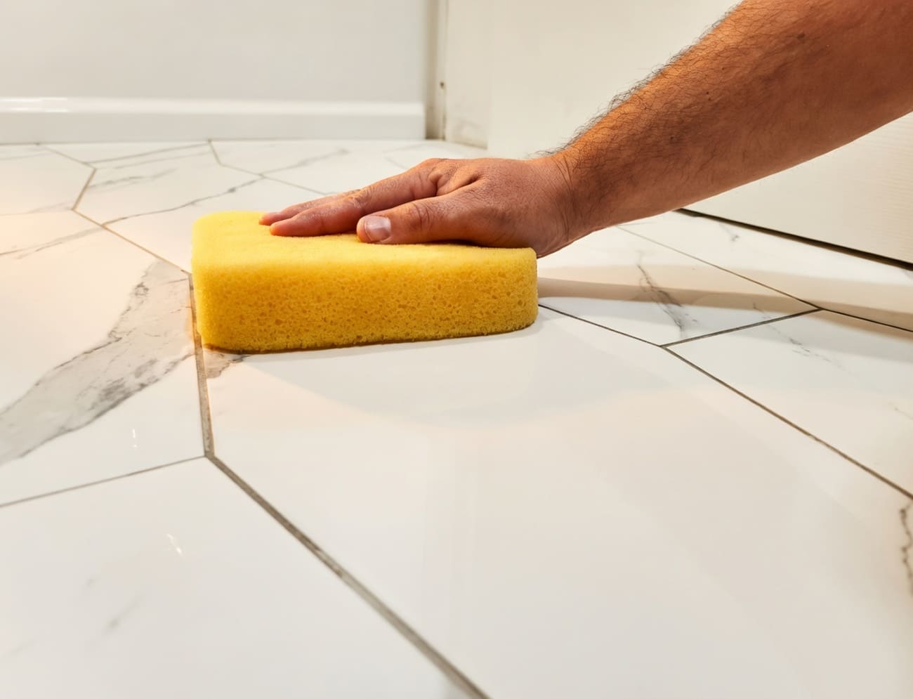 Подождите 15–30 минут (проверьте пальцем: не должен оставлять след). Круговыми движениями влажной губки (часто промывайте!) аккуратно снимайте лишнее. Лайфхак: не тяните вдоль шва — получите некрасивые углубления. Тайминг — ключ к успеху!
