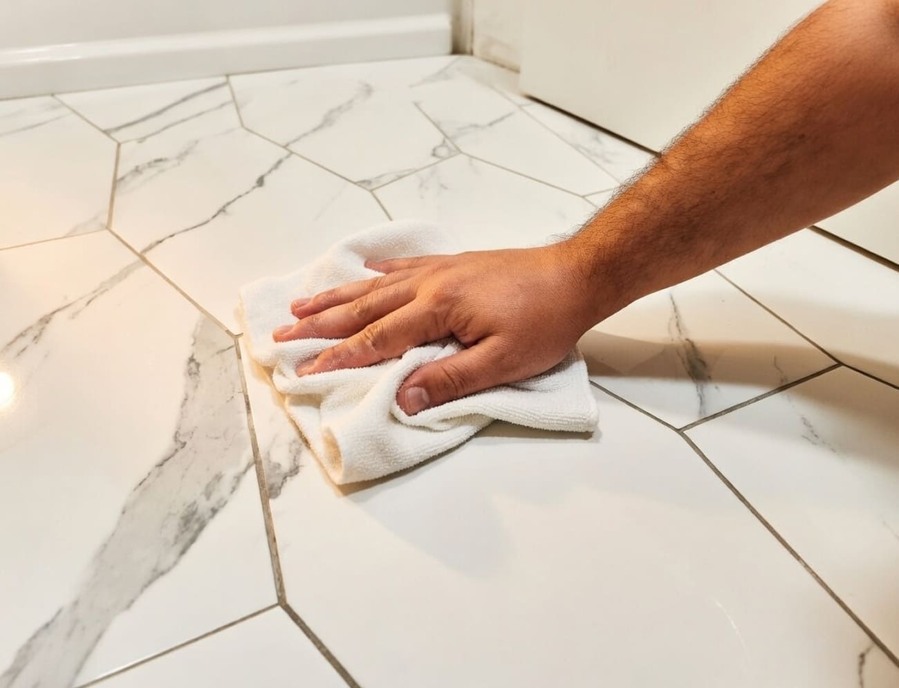 Дайте плитке «отдохнуть» 24–48 часов, а лучше 72: клей должен полностью схватиться. Уберите крестики-разделители. Тщательно очистите швы ножом, щёткой или пылесосом — они должны быть чистыми минимум на 2/3 глубины. Для цементной затирки слегка увлажните швы водой. Почему это важно? Грязные швы = трещины и отслоение через год. Не ленитесь!